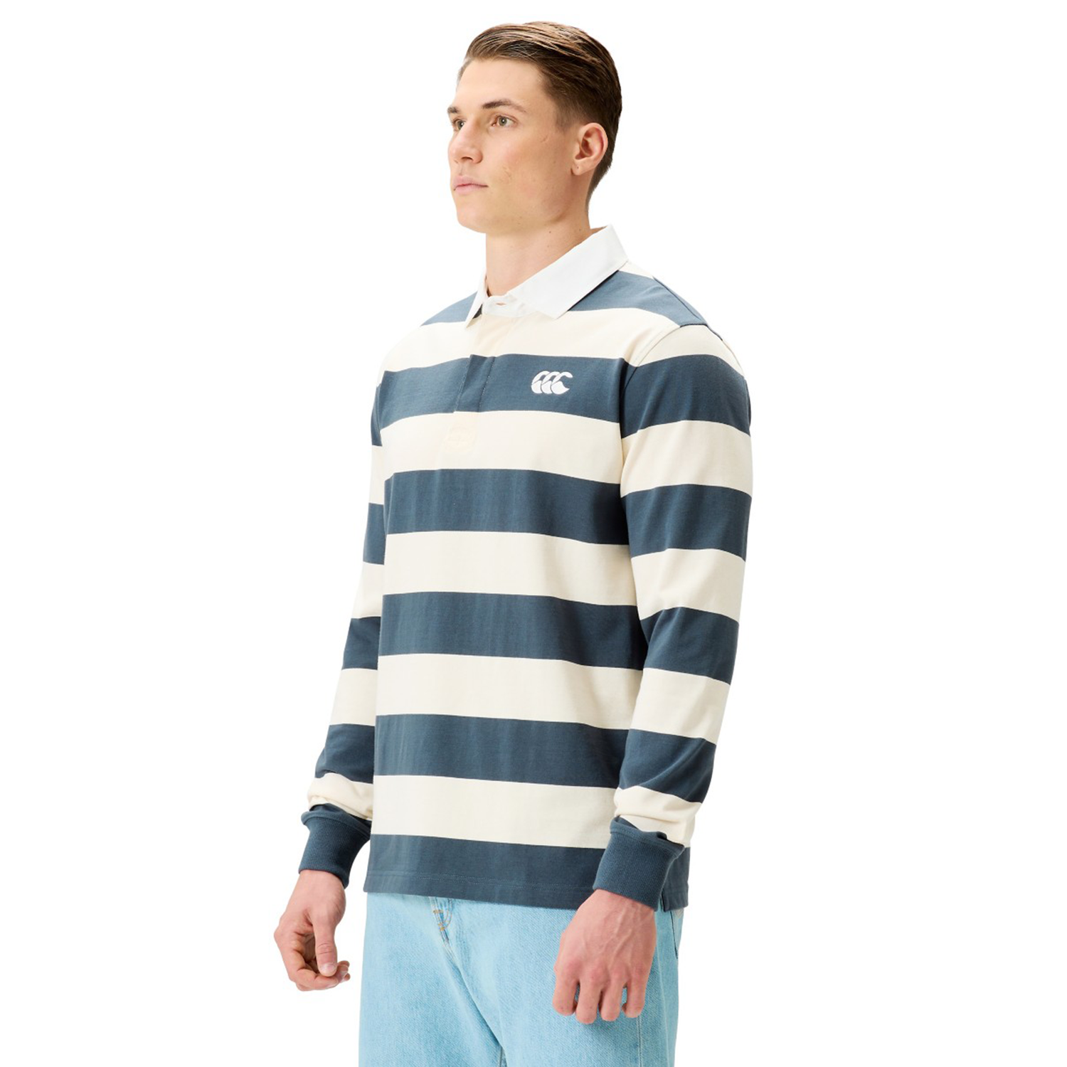 Classic Rugby Style: Featuring a traditional cotton drill collar, a 3-button placket, ribbed cuffs, and side slits.