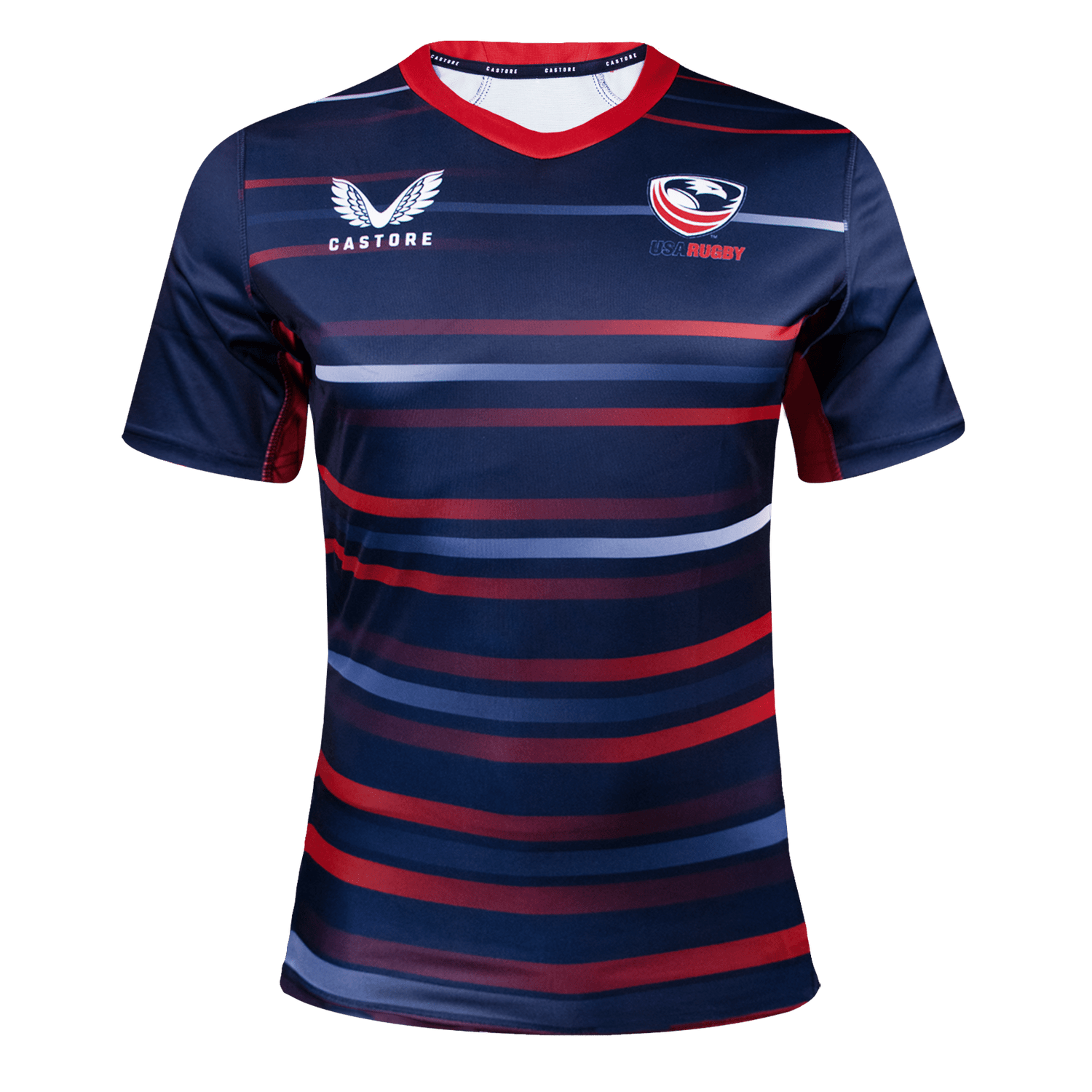 Introducing USA Rugby's new 2022 away replica jersey. Constructed of high-tech, moisture-wicking fabric and cut specifically for ease of movement, this shirt keeps one comfortable and dry whether training, cheering on the Eagles, or hanging out after the match. The navy shirt hosts a sublimated design, featuring ombre red and white stripes on front, a red collar, and red side inserts.